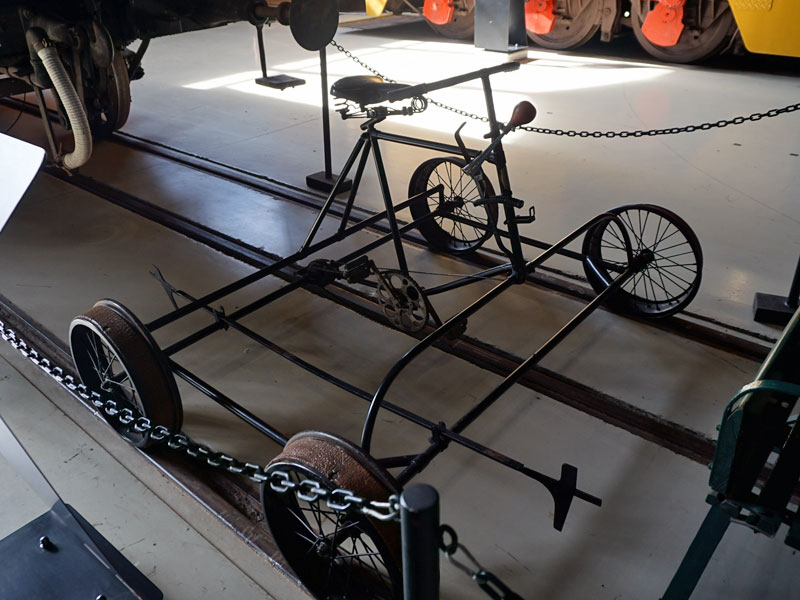 4輪の1人乗り軌道自転車、4884号はドイツ製。ライトと警笛を装備し、人力でペダルを踏んで走行。線路の検査に使用し、線路幅を測るゲージも搭載。