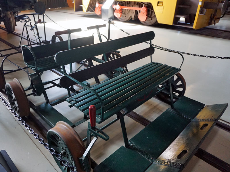 4輪の4人乗り軌道自転車、2067号もドイツ製。線路の検査に使用し、検測員は前の座席に乗車。後部座席の乗員が手漕ぎで運転し、手前の赤いレバーで手動ブレーキを操作する。