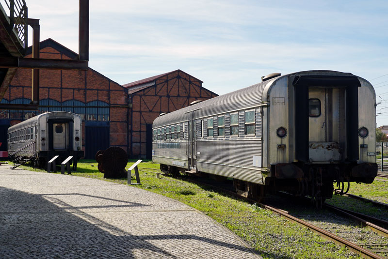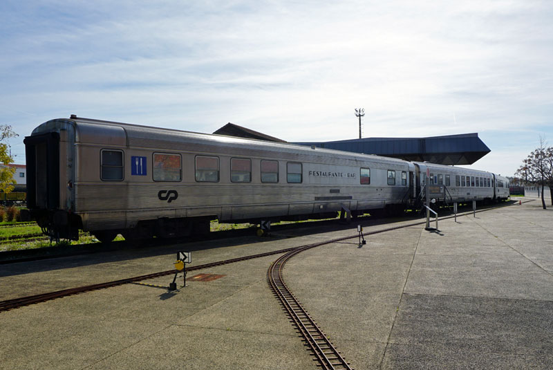ステンレス製の客車は、腐食の心配がないためなのか屋外に留置。左の車両は、1963年から1964年にかけて米国バッド社のライセンスに基づきポルトガルで製造された食堂車。車内は厨房とカウンター、4人のテーブル席が10箇所40席。当初は最高速度120km/hだったが、1970年代の台車交換により140km/hに向上。南急行などで2010年まで運行。
