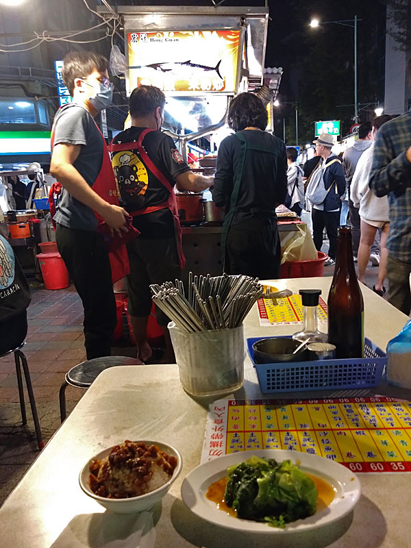 もう一軒、別の屋台で魯肉飯と燙青菜。これだけ食べて日本円換算865円なので、夜市を利用している限り円安も怖くはないが、何処にもビールを置いていないのがちょっとね。コンビニで買って持ち込めばいいのだけど。