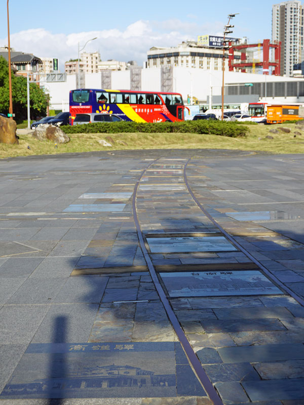 食後は、台鉄の縦貫線が地下化された跡の大通りを北へ、北門に向かうことに。台北駅方面へ、東に曲がる交差点で線路を見つけた。敷石の間には、手前から高雄驛、台南驛、嘉義驛などを描いた石板が埋め込まれている。カーブもきついので、列車が走っていた線路ではなく、後から作ったものでしょう。
