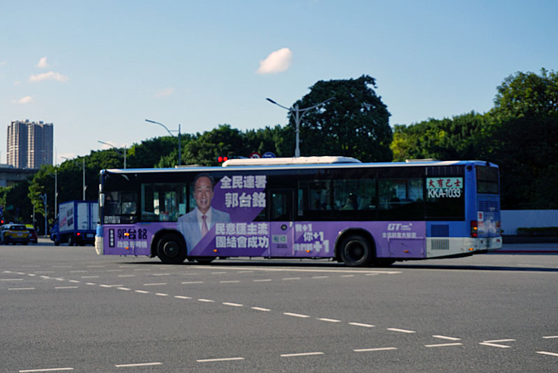 交差点を曲がる路線バスのラッピング広告は、シャープを買収した鴻海精密工業の創業者で、実業家の郭台銘。この3ヶ月後に行われた台湾の総統選挙に向け、広告バスを走らせていたようだが、支持が広がらなかったのか立候補を取りやめている。