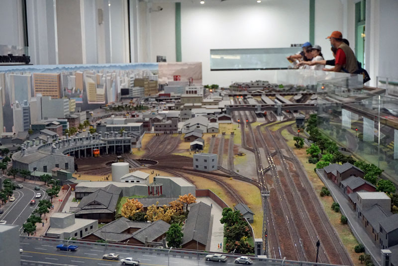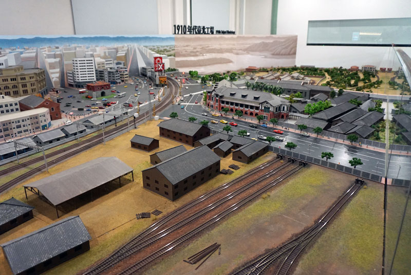 縦貫線が地上を走っていた頃の台北駅周辺を再現したジオラマ。右上には、国立台湾博物館鉄道部パークとなった、台湾鉄道管理局庁舎もある。高雄方面に向かう線路が左に大きくカーブするところが、先ほど交差点で路面に線路のあった場所。