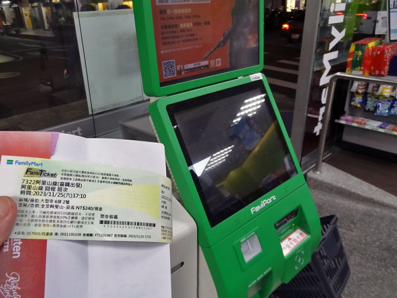 ホテルへの帰り道で、4日後の土曜夕刻の阿里山から嘉義へ、最終便のバスの切符を買いに全家便利商店(ファミマ)へ立ち寄り。