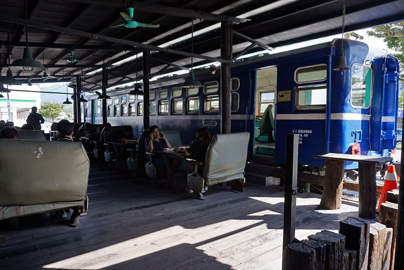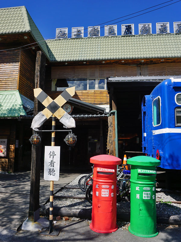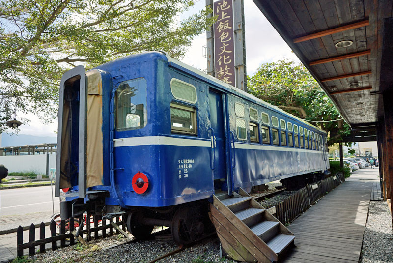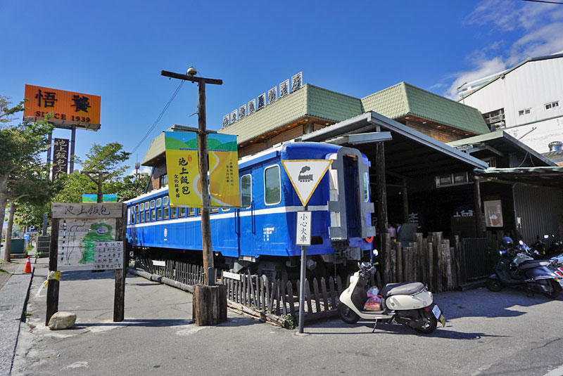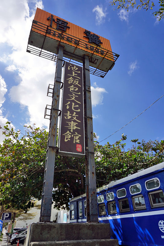 交差点の所に“悟饕SINCE1939 池上飯包文化故事館”の大きな看板と、1980年以前の762mmのナローゲージ時代の台東線で使われ、その後1067mmに改軌されたディーゼルカーの付随車(日本の国鉄でいえばキサハ)が2両。