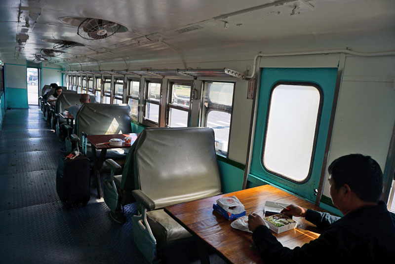 気動車の車内は片側の座席は撤去し、シートピッチも広げて間にテーブルを設置。