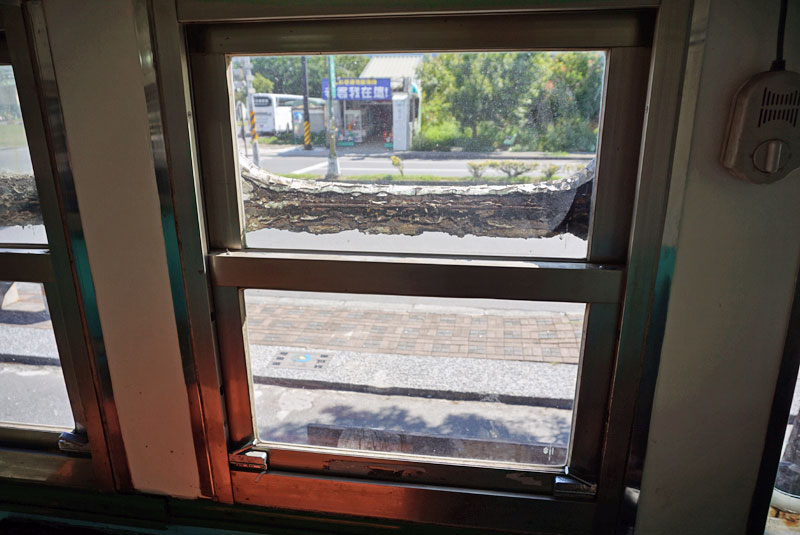 車体のバス窓の部分が、中から見ると腐食が激しい、内側に上下2段式のサッシを取り付ける改造がなされているが、果たしてこの車両の現役時代の改造か、駅弁屋に引き取られた後の修理なのか。