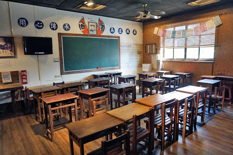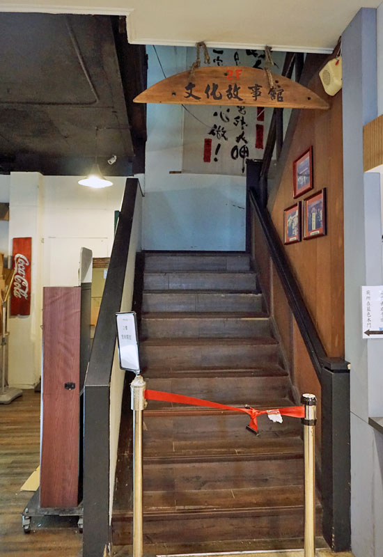 “文化故事館”の看板がぶら下がっている、店内の二階に上がる階段がテープで閉じられている。