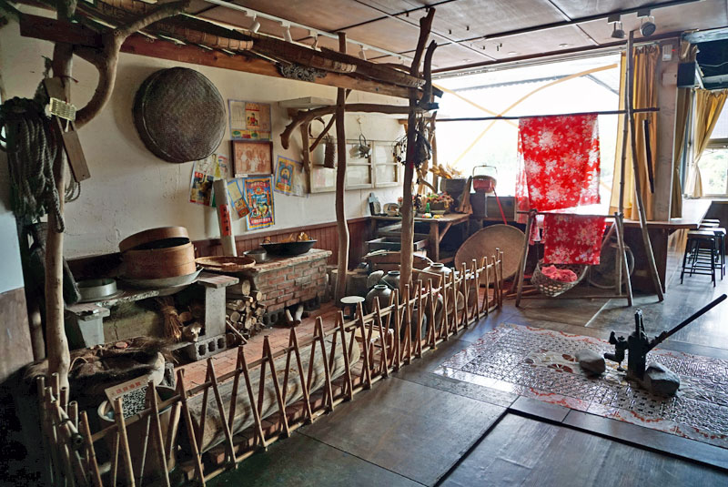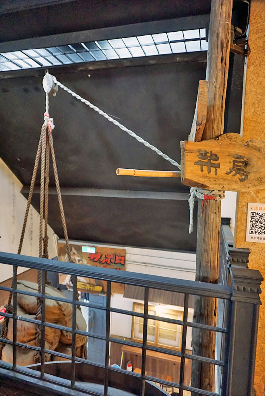 もとは、二階は米の貯蔵場所だったのか、滑車で米袋を吊り上げている。