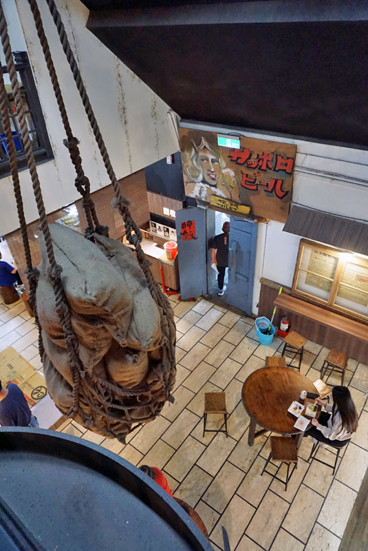 何故か、二階から見下ろす一階の店内に、カタカナで“サッポロビール”の看板。