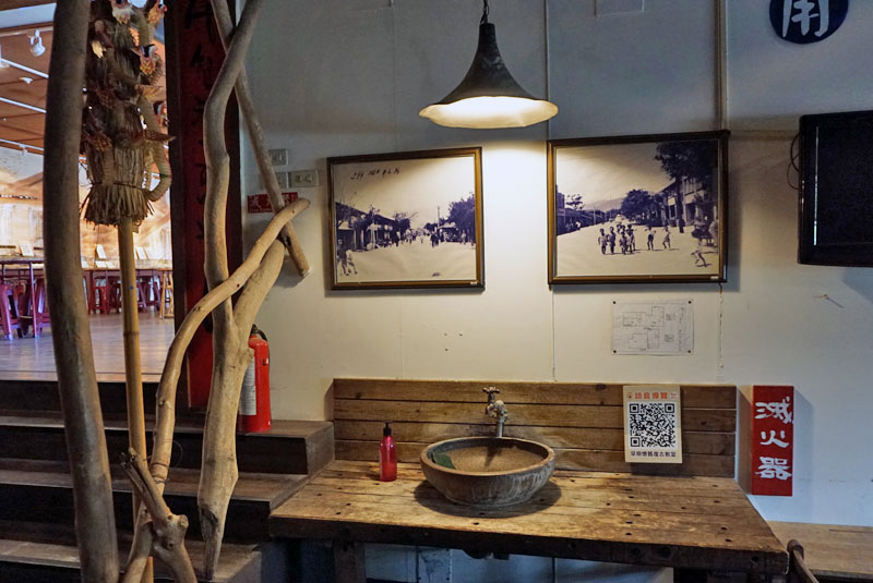 店の入り口には、赤と緑のポストに“停看聴”(止まれ、見よ、聞け)の踏切警報器。