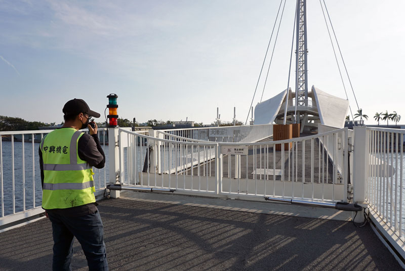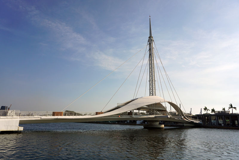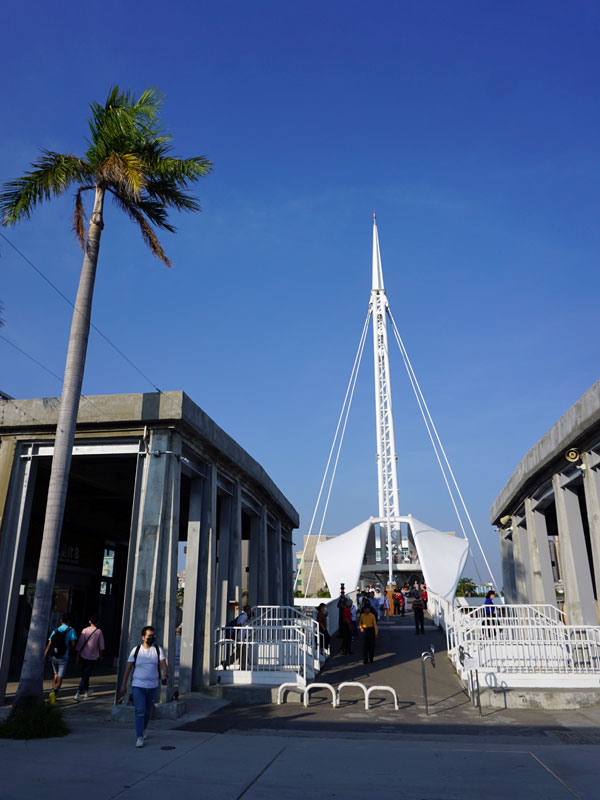 駁二大義の停留所のすぐ横に架かる、2020年に開通した大港橋。駁二芸術特区と、対岸の倉庫街を再開発した蓬莱商港区をつなぐ、台湾で始めての水平旋回する橋.。全長110mは、アジア最長の港を跨ぐ旋回橋。