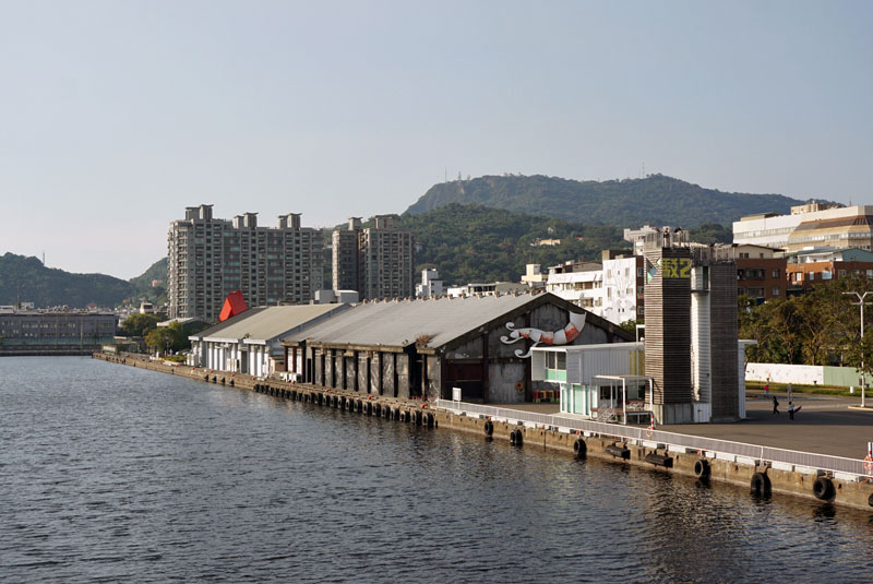 係員がゲートを開けると、待っていた観光客が橋を渡り始める。ちなみに、通れるのは歩行者だけだが、自転車も降りて押せば通行可能らしい。橋からみた駁二芸術特区側。港湾の水面は、この先で行き止まり。